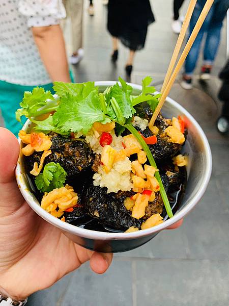 老長沙臭豆腐 每份10元人民幣 - 來到老街一定要嚐嚐這黑色的臭豆腐,醬汁本身就微辣了,配料是醃製的辣蘿蔔,很夠味