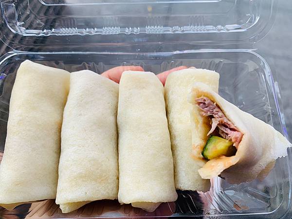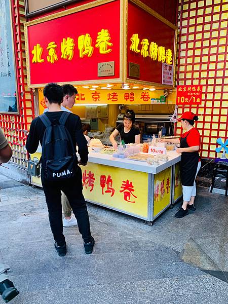 北京烤鴨卷 每盒5個10元人民幣 - 每個卷裡有一片烤鴨肉、一小條切黃瓜和一小根蔥,搭配鹹鹹甜甜的醬料,還不錯吃,小小遺憾就是吃起來皮有點多料偏少,但還是很推薦嘗試