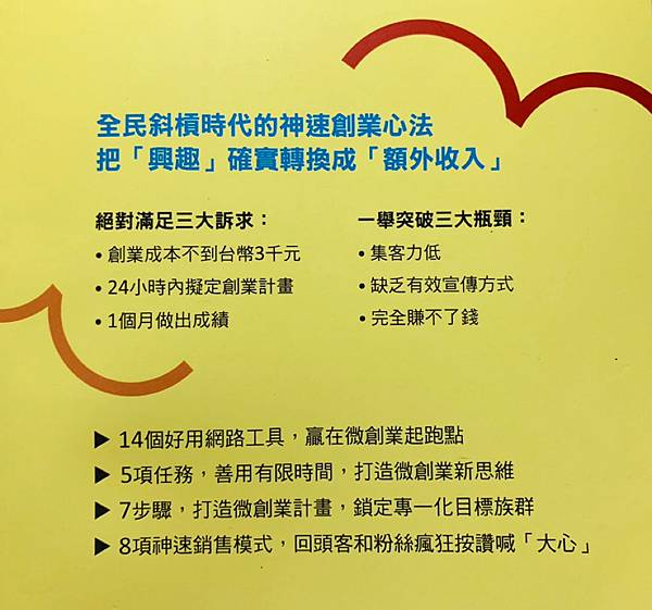 只要跟著這些步驟、要點思考準備,微創業的夢想已經實現了一半,另一半就要再好好使用書中介紹的相關工具、網路資訊,還有作者提出很多想要微創業但猶豫的點,並ㄧㄧ提供解答,而樂樂覺得最重要的是......放膽去做吧!光想不做,是永遠不能前進的~~~
