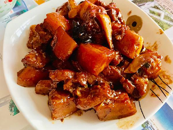 - 放入 糖漿、少許紹興酒、鹽、白胡椒,蓋鍋悶煮約1個小時,後開蓋稍微拌炒收汁即可。