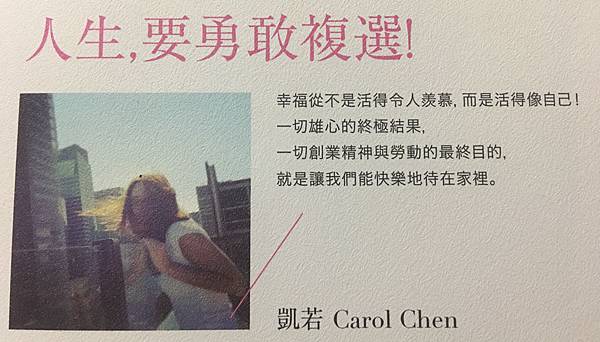 曾經我也像書中提到的一樣,「習慣為自己築起安穩的堡壘,每天安全的待在裡頭做著該做好的事就好,對於給自己挑戰非常不習慣」,為了追求安安穩穩而壓抑自己的想法,照著大家認為最平穩的路走就好,但是認識棠之後,我發現自己內心並不是真正的喜歡這樣生活,我好奇想了解並喜歡嘗試許多有興趣的人事物,棠總鼓勵我誠實地說出自己的想法和想要,不要因為怕與人不同就總是違背自己心意去配合別人,如果真的好奇想嘗試新事物,只要不傷害自己傷害別人,那就別擔憂太多,果斷的設下目標和可接受的停損點,拼了全力去嘗試吧,不論成功或失敗都會變成自己的經驗值!而我也漸漸發現,雖然一開始這樣的心態和行動改變真的非常煎熬,但是習慣後讓我覺得比以前自由快樂並精彩很多~當然,這過程中有著一群保持懷疑卻依然無條件支持我的家人和朋友們,是非常幸福和感謝的❤️😘🍀🍀 不能主動對自己殘酷,就只能等著別人對我們殘酷!而當我們願意對自己狠一點,別人就會對我們好一點。 🍀🍀書中凱若也非常建議大家「公私分明」,就像凱若本身既是CEO、作家、講師、粉絲團團主,更是妻子和母親的身份,身兼多職自然相當忙碌,但是她依然將工作與私人時間界限清楚,除非是非常緊急狀況,否則她是會全心專注於陪伴家人而不處理公事的。她說:我們雖然從事服務業,但我們也是人也需要私人生活,服務業的本質是尊重與體貼,對象不止是顧客,也包含自己與家人。這讓我想到辦公室裡常聽的一句話,做業務就是要將工作與生活結合,我也一直覺得這是成功的唯一辦法,因此常常是家人在身邊,而我完全不曉得家人說了什麼,因為整個心思都在回覆及處理顧客不時丟過來的問題,甚至好幾次家人出遊旅程中都還要陪我去找顧客工作!但是現在我決定開始重新定義,畢竟當初會選擇這份工作的原因之一,就是想要多一點自由時間陪伴親愛的家人。