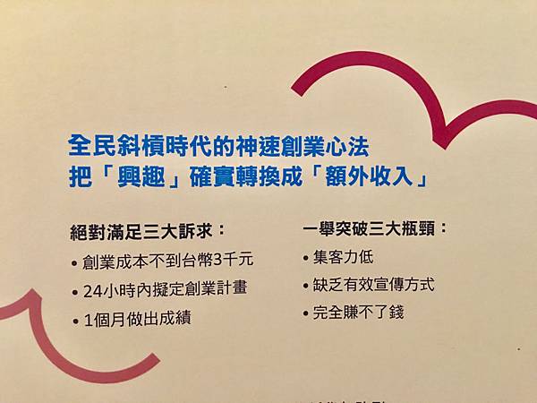還在工作與創意間游移嗎?總覺得自己有個創業夢無法實現嗎?覺得生活壓力大,想開創自己的斜槓人生嗎?如果答案是,那樂樂很推薦你可以看看這本書思考一下,甚至可以大膽嘗試自己的微型創業計劃,為自己開啟斜槓收入!這本書和樂樂之前看的創業相關書籍很不一樣,不需要落落長的創業企劃書,不需要大量數據的市場分析,也不需要大額創業基金,本書分享的是一種微創業的新思維,只要利用幾千元的成本、幾小時的擬定創業計畫,加上1-3個月的嘗試期間,快速有效率地把自己的「興趣」轉換成「額外收入」的心法與工具書。在微創業計劃當中,重點在於「有多快能做出成績」,而不是許多人所在意的「一次能夠賺進多少錢」。1-3個月內確定能夠賺錢後,即使收入只有100元也沒關係,因為接下來就是想辦法增加顧客的購買次數,也就是提升「單價x數量」中的數量,這樣自然而然的總收入也會跟著增加了。書中作者提出了微創業的7步驟,並分別詳細說明各各步驟的實際案例與操作心法,樂樂在這裡就略略的列出這7步驟,說明與案例部分就請大家參考書籍囉,相信每個人的體悟都會有所不同的~