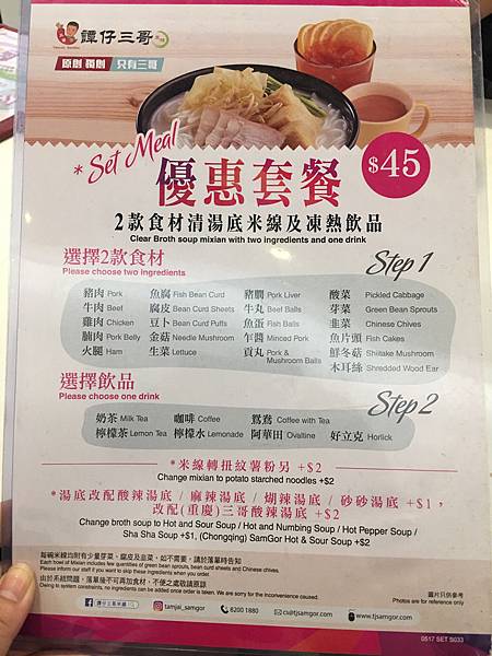 之前搜尋香港美食一直有跑出「譚仔三哥米線」的介紹,社群裡也有香港朋友大推,說自己是吃譚仔三哥長大的,但是每次都會被棠推薦的其他美食給吸引而錯過😆這一次因為提早到了機場,終於有機會在登機前一嚐所願啦~~ 套餐組合一大碗米線加一杯飲料只要港幣45元唷,而且點餐步驟超簡單的~ 《 步驟1 》先挑兩種自己喜歡的小配料,配料樣式很多,我挑了牛肉和魚蛋,不知道為什麼每次來到香港就莫名其妙的愛吃魚蛋😆還有其他加價的配料~ 《 步驟2 》 選擇湯底,總共有六種湯底可以挑,不過只有清湯底外,其他五種都要➕1元唷~既然是在機場吃的,樂樂馬上選了機場特定的砂砂湯底😍 《 步驟3 》 最後就是選擇飲料啦~炎熱的夏天來杯冰鎮凍檸茶最過癮了~🍀除了米線和飲料,譚仔三哥也有其他小菜和雞翅可以點來吃😋 很特別的是有「少米」可以選,還可以折1元呢!原份量的米線超級多!應該是兩大坨米線的量,連樂樂這樣的大胃王都吃不完啊~ 看看,是不是超級大碗啊~米線真的是滿滿的👍